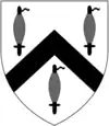 Argent, a chevron between three spindles sable | |