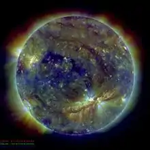 The coronal heating problem in solar physics relates to the question of why the temperature of the Sun's corona is millions of kelvins versus the thousands of kelvins of the surface. Several theories have been proposed to explain this phenomenon but it is still challenging to determine which of these is correct.[27] The problem first emerged when Bengt Edlen and Walter Grotrian identified Fe IX and Ca XIV lines in the solar spectrum.[28] This led to the discovery that the emission lines seen during solar eclipses are not caused by an unknown element called "coronium" but known elements at very high stages of ionization.[27] The comparison of the coronal and the photospheric temperatures of 6,000K, leads to the question of how the 200 times hotter coronal temperature can be maintained.[28] The problem is primarily concerned with how the energy is transported up into the corona and then converted into heat within a few solar radii.[29]