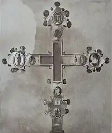 The cross was made of gold plates by court goldsmiths. The entire front is covered with a rock crystal plate that allows one to see the relics of the Crucifixion of Christ: wood from the Holy Cross, thorns, a part of the sponge, rope, and a nail. The sides of the cross are lined with sapphires that are set in such a way so that light could penetrate them, thus creating a halo. The back of the cross is adorned with engraved gem cameos with beautiful reliefs that date from antiquity to the 12th century and cover small compartments for other precious relics. In the middle of the back of the cross, there is a small rock crystal window with another part of the wood from Christ's cross.[2]