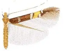 Male, female. Forewing length 3.2-3.7mm. Head: frons shining ochreous-white with greenish and purplish reflections, vertex and neck tufts shining pale bronze brown with greenish and reddish reflections, laterally lined white, collar shining pale bronze brown with greenish and reddish reflections; labial palpus first segment very short, white, second segment three-quarters of the length of third, dorsally brown, ventrally white, third segment dorsally white, ventrally brown, extreme apex brown; scape dorsally bronze brown with a white anterior line, ventrally white, antenna shining brown with an interrupted white line from base to beyond one-half with a short uninterrupted section distally, followed towards apex by six brown segments, six white, eight brown, six white and one brownish segment at apex. Thorax and tegulae shining pale bronze brown with greenish and purplish gloss. Legs: shining dark greyish brown, tibia of midleg ochreous-grey, foreleg with a white line on tibia and tarsal segments, tibia of midleg with silver metallic oblique basal and medial streaks and a white apical ring, tarsal segments one, two and four with white apical rings, segment five missing, hindlegs missing, spurs dark greyish brown, ventrally white. Forewing shining dark brown with reddish gloss, at one-fifth three short silver metallic streaks of equal length with bluish reflection, a subcostal and a medial just above fold, and a slightly wider subdorsal just below fold, beyond one-half a shining dark yellow transverse fascia, narrowing towards dorsum, bordered on the inner edge by a slightly inwardly oblique tubercular silver metallic fascia with greenish and purplish reflections, bordered at the outer edge by similarly coloured costal and dorsal spots, the dorsal spot three times the size of the costal and more towards base, the fascia outwardly and the costal and dorsal spot broadly edged dark brown inwardly, the costal spot outwardly edged by a narrow white costal streak, apical line as a silver metallic spot with bluish reflection in the middle of the apical area and a broad white streak in the cilia at apex, cilia dark brown, paler on dorsum towards base. Hindwing shining dark greyish brown, cilia greyish brown. Underside: forewing shining brown with the white costal and apical streak distinctly visible, hindwing shining greyish brown. Abdomen dorsally shining brown with some greenish gloss, laterally and ventrally shining dark greyish brown with greenish reflection, segments broadly banded shining white posteriorly, anal tuft shining greyish brown.[1]