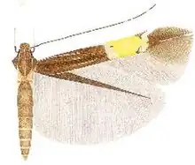 Male. Forewing length 3.6 mm. Head: frons shining silvery-white with greenish and reddish reflections, vertex and neck tufts bronze brown with reddish gloss, laterally and medially narrowly lined white, collar bronze brown; labial palpus first segment very short, white, second segment four-fifths of the length of third, brown with white longitudinal lines laterally and ventrally, third segment white, lined brown laterally; scape dorsally dark brown with a white anterior line, white ventrally, antenna shining dark brown with a white line from base to two-thirds, sometimes interrupted, followed towards apex by two white segments, two dark brown, two white, ten dark brown, four white and five dark brown segments at apex. Thorax and tegulae bronze brown with reddish gloss, thorax with a white median line, tegulae lined white inwardly. Legs: greyish brown with reddish gloss, femora of midleg and hindleg shining pale ochreous, foreleg with a white line on tibia and tarsal segments one to three and five, tibia of midleg with white oblique basal and medial lines and a white apical ring, tarsal segments one and two with white apical rings, segment five entirely white, tibia of hindleg as midleg but with an additional ochreous subapical ring, tarsal segments one and two with white apical rings, other tarsal segments missing, outer spurs whitish, inner spurs greyish brown, apically paler. Forewing bronze brown with reddish gloss, five white lines in the basal area, a costal from one-third to the transverse fascia, a subcostal from base to one-third, bending from costa distally, a short and straight medial above fold from one-quarter to the end of the subcostal, a subdorsal, twice as long as the medial, below fold and from about one-quarter to two-fifths, a narrow dorsal from one-eighth to start of the subdorsal, a broad yellow transverse fascia beyond the middle, bordered at the inner edge by a silver metallic fascia, almost perpendicular on dorsum, narrowing towards costa and not reaching it, subcostally on the outside with a short blackish-brown streak, bordered at the outer edge by two silver metallic costal and dorsal spots, both spots inwardly lined brown, the dorsal spot twice as large as the costal and slightly more towards base, both fascia and spots have some greenish reflection, a white costal streak from the costal spot, a narrow shining white, more or less interrupted, apical line from the distal half of the apical area, widening in the apical cilia, cilia bronze brown around apex, brownish grey towards dorsum. Hindwing shining dark brownish grey, cilia brownish grey. Underside: forewing shining pale greyish brown, the white apical line only visible in the apical cilia, hindwing greyish brown. Abdomen dorsally brown, segments four to six paler banded posteriorly, ventrally dark greyish brown with a broad white longitudinal streak in middle, segments broad shining white banded posteriorly, anal tuft ochreous-grey.[1]
