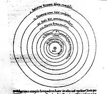 The idea of celestial spheres was developed in the cosmological models of Plato, Eudoxus, Aristotle, Ptolemy, Copernicus, and others.[11] They believed in a stable cosmos created by God, where distinct realms were subject to different kinds of order. Some Europeans maintained the Aristotelian view that infinity could only be seen as an attribute of God, with the cosmos being finite. Furthermore, following the Aristotelian view that "nature abhors a vacuum", some Europeans believed that the space between the spheres were filled with air.[10] This theory persisted until the Scientific Revolution, when the discovery that the Sun was in the center of the planetary system rocked cosmological understanding to its core. Other theories such as Atomism posited a void of atoms as the fundamental elements of physics, while Stoicism postulated a void allowing for the cosmos to expand and contract in volume through its cycles.[12][13]