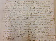 An opinion on the trials was sought from the ministers of the area in mid June. In an anonymous work written years later, Cotton Mather took credit for being the scribe: "drawn up at their desire, by Cotton Mather the younger, as I have been informed."[34] The "Return of the Several Ministers" ambivalently discussed whether or not to allow spectral evidence. The original full version of the letter was reprinted in late 1692 in the final two pages of Increase Mather's Cases of Conscience. It is a curious document and remains a source of confusion and argument. Calef calls it "perfectly ambidexter, giving as great as greater encouragement to proceed in those dark methods, then cautions against them… indeed the Advice then given, looks most like a thing of his composing, as carrying both fire to increase and water to quench the conflagration."[35][36] It seems likely that the "Several" ministers consulted did not agree, and thus Cotton Mather's careful construction and presentation of the advice, sent from Boston to Salem, could have been crucial to its interpretation (see photos).