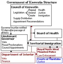 The Council of Keewatin was an unelected legislative body and territorial government for the now defunct District of Keewatin in Canada. The District of Keewatin was created by the passage of the Keewatin Act on October 7, 1876[1] from a portion of Canada's North West Territories.[A] Lieutenant Governor Alexander Morris convinced the government that the new territorial government of the North West Territories would be unable to effectively administer land to the north and east of Manitoba.[2] Shortly after the District of Keewatin was formed a large group of Icelanders arrived, infected with smallpox which quickly spread to the indigenous First Nation population. The Government of Canada allowed the Council to be formed for the purpose of containing the smallpox epidemic. The Council also administered Indian treaty claims, immigrant land claims, Hudson's Bay Company trading post concerns as well as policing and health care. The Council lasted from November 25, 1876, until April 16, 1877, after which control of the territory was returned under federal authority.