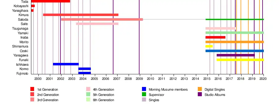 | Past members | As Country Musume: Asami Kimura Miuna Saito Miki Fujimoto Asami Konno Rika Ishikawa Rinne Toda Azusa Kobayashi Hiromi Yanagihara Mai Satoda As Country Girls: Uta Shimamura Manaka Inaba Momoko Tsugunaga Nanami Yanagawa Risa Yamaki Chisaki Morito Mai Ozeki Musubu Funaki |