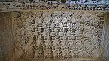 The chamber on the western side of the courtyard, through which visitors enter the Court of the Lions today, is known as the Sala de los Mocárabes or "Hall of the mocárabes (muqarnas)". It is a narrow rectangular hall. Originally, it was covered by a ceiling of muqarnas vaults and was considered one of the most beautiful rooms in the Alhambra. However, in 1590 the chamber was largely destroyed by the explosion of a nearby gunpowder magazine. The ceiling was eventually replaced by the current Baroque-style plaster vault in 1714, designed by Spanish painter Blas de Ledesma.[27][28] The hall is connected to the rest of the courtyard via three muqarnas archways.[27]
