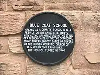 The original Blue Coat school was founded as a school for girls[5] in 1714, close to Holy Trinity church in the city centre of Coventry,[6] close to the ruins of St Mary's Priory and Cathedral.[7] It was re-built on the same location in 1856.[8]