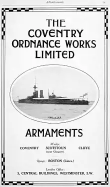 By 1909 Coventry Ordnance Works had establishments, as well as at Coventry, at Scotstoun for manufacture of ordnance and gun equipment; for cordite shell loading and explosive magazines at Cliffe; and a gun-proving ground with a land range of 22,000 yards at Boston and was handling an order for 12 inch mountings of one of the new battleships.[1] While to that time the works had been manufacturing the smaller sizes of Naval Guns and Mountings as well as Guns, Gun carriages, Ammunition and other military accessories, they had already extended their works since 1906 and had begun the manufacture of Guns and Turrets up to the largest sizes for both Battleships and Cruisers for the Admiralty. At Scotstoun a new factory had been built with a wet dock, pits and machinery for the erection and transhipping of the heaviest guns and mountings[2] and hydraulic barbettes of the firm's own design but it was unused until 1911.[3] A complete factory for the manufacture of Fuzes had also been installed in Coventry.[2]