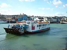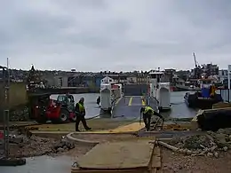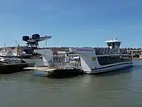 The current vessel Floating Bridge No.6 was built by Welsh boat builders Mainstay Marine. It has an expected lifespan of 40 years and around twice the carrying capacity of the previous vessel, Floating Bridge No.5. It was installed on the Isle of Wight on 3 May 2017.[16] Despite delays, the vessel's maiden voyage took place 10 days later on 13 May 2017.[17] The following day, the vessel broke down due to a power cut, forcing passengers to wade through the River Medina to disembark the ferry. Further problems were caused by the angle of the slipway causing cars to scrape bumpers when loading and unloading from the East Cowes side.[18] On 15 May 2017, the Maritime and Coastguard Agency suspended the service, citing "training issues". The temporary pedestrian launch which had been used after the previous vessel's retirement and the new vessel's installation was re-instated, but vehicles were once again forced to take the 10-mile round trip through Newport.[19] After several months of suspension and intermittent operation, full service resumed in early 2018.