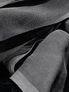 Crêpe, also spelled crepe or crape (from the French crêpe),[1] is a silk, wool, or synthetic fiber fabric with a distinctively crisp and crimped appearance. The term "crape" typically refers to a form of the fabric associated specifically with mourning.[2] Crêpe was also historically called "crespe" or "crisp".[3]