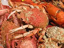 Around 65 species of crab occur in the waters of the British Isles.[1][Note 1] All are marine, with the exception of the introduced Chinese mitten crab, Eriocheir sinensis, which occurs in fresh and brackish water. They range in size from the deep-water species Paromola cuvieri,[3] which can reach a claw span of 1.2 metres (3 ft 11 in),[4] to the pea crab, which is only 4 mm (0.16 in) wide and lives inside mussel shells.