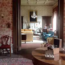 Craigston Castle is a 17th-century country house located about 4 miles (6.4 kilometres) north-east of Turriff, Aberdeenshire, Scotland, and is an historic home of the Urquhart family. The U-plan castle is composed of two main wings flanking the entrance and connected by an elevated arch, and surmounted by a richly corbelled parapet.[4] There are bases for corner turrets near the top corner of each wing, but the turrets themselves do not appear to have ever been completed. The wood carvings in the drawing room depict biblical themes and Clan Urquhart heraldic artefacts.