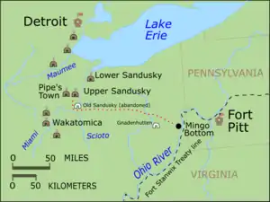 When the American Revolutionary War began in 1775, the Ohio River marked a tenuous border between the American colonies and the Natives of the Ohio Country. Ohio Natives—Shawnees, Mingos, Lenapes (Delawares), and Wyandots—were divided over how to respond to the war. Some Native leaders urged neutrality, while others entered the war because they saw it as an opportunity to halt the expansion of the American colonies and to regain lands previously lost to the colonists.[1]