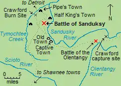 After being separated from the main body of men, Crawford, Knight, and four other stragglers traveled southeast along the Sandusky River in present-day Crawford County, Ohio. On June 7, they came upon a party of Lenapes about 28 miles (45 km) east of the battlefield. Knight raised his gun, but Crawford told him not to fire. Crawford and Knight knew some of these Lenapes, who were part of a band led by a war chief named Wingenund.[135] Crawford and Knight were taken prisoner, but the other four Americans escaped. Two of them were later tracked down, killed, and scalped.[136] Crawford and Knight were taken to Wingenund's camp, where they found eight other prisoners.[137] On June 9, while the other prisoners were taken to Old Town, Crawford was taken to Half King's Town where he met with Simon Girty. Girty told Crawford the Lenapes were enraged about the Gnadenhütten massacre, and offered to assist Crawford in escaping, but Crawford was too exhausted and discouraged to make an attempt.[137]