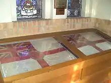 Numerous memorials are at the base with many including stained glass windows in the two chapels: Our Lady of the Sea (Catholic), and St Mark's (Anglican/interdenominational). St Mark's chapel also houses retired King's/Queen's colour flags of George V, George VI, and Elizabeth II.