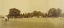 In 1611, the year Cotgrave's dictionary was published, ecclesiastical court records at Sidlesham in Sussex state that two parishioners, Bartholomew Wyatt and Richard Latter, failed to attend church on Easter Sunday because they were playing cricket. They were fined 12d each and ordered to do penance.[18] This is the earliest mention of adult participation in cricket and it was around the same time that the earliest known organised inter-parish or village match was played – at Chevening, Kent.[6][19] In 1624, a player called Jasper Vinall died after he was accidentally struck on the head during a match between two parish teams in Sussex.[20]