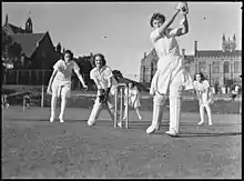 Cricket is one of many games in the "club ball" sphere that basically involve hitting a ball with a hand-held implement; others include baseball (which shares many similarities with cricket, both belonging in the more specific bat-and-ball games category[2]), golf, hockey, tennis, squash, badminton and table tennis.[3] In cricket's case, a key difference is the existence of a solid target structure, the wicket (originally, it is thought, a "wicket gate" through which sheep were herded), that the batter must defend.[4] The cricket historian Harry Altham identified three "groups" of "club ball" games: the "hockey group", in which the ball is driven to and from between two targets (the goals); the "golf group", in which the ball is driven towards an undefended target (the hole); and the "cricket group", in which "the ball is aimed at a mark (the wicket) and driven away from it".[5]