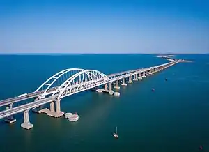 The Crimean Bridge (Russian: Крымский мост, romanized: Krymskiy most, IPA: [ˈkrɨmskʲij most]), also called Kerch Strait Bridge or Kerch Bridge, is a pair of parallel bridges, one for a four-lane road and one for a double-track railway, spanning the Kerch Strait between the Taman Peninsula of Krasnodar Krai in Russia and the Kerch Peninsula of Crimea. Built by the Russian Federation after the annexation of Crimea at the start of 2014, the bridge cost ₽227.92 billion (US$3.7 billion)[11] and has a length of 19 km (12 mi),[lower-alpha 4] making it the longest bridge in Europe[13][14][15] and the longest bridge ever constructed by Russia.[16][lower-alpha 5]