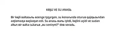 | Бутюн инсанлар сербестлик, менлик ве укъукъларда мусавий олып дюньягъа келелер. Олар акъыл ве видждан саибидирлер ве бири-бирилеринен къардашчасына мунасебетте булунмалыдырлар. | Bütün insanlar serbestlik, menlik ve uquqlarda musaviy olıp dünyağa keleler. Olar aqıl ve vicdan saibidirler ve biri-birilerinen qardaşçasına munasebette bulunmalıdırlar. | All human beings are born free and equal in dignity and rights. They are endowed with reason and conscience and should act towards one another in a spirit of brotherhood. |