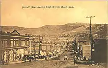 On 20 October 1890, Robert Miller "Bob" Womack discovered a rich ore and the last great Colorado gold rush began. By July 1891, a post office was established. By November, hundreds of prospectors were camping in the area. Rather than investing in mines, Denver realtors Horace Bennett and Julius Myers sought wealth by platting 80 acres of land for a townsite which they named Fremont. The town consisted of 30 platted blocks containing 766 lots. Each lot sold for $25 and $50 for corner lots. Within a year, the lots value increased and sold for at least $250 each. Months later, investors from Colorado Springs platted 140 acres near Fremont and called their town Hayden Placer. Bennett and Myers filed another plat near the Broken Box Ranch and named it Cripple Creek. The towns’ combined population total 600-800 people by the end of 1891. By 1892, the Cripple Creek Mining District name had caught on and in June 1892, the post office assigned the Cripple Creek name to Fremont, Hayden Placer, and Cripple Creek and all the settlements became known as one. From 1892, Bennett and Myers oversaw the Fremont Electric Light and Power Company. The district’s first telephone was established in 1893. Thousands of prospectors flocked to the district, and before long Winfield Scott Stratton located the famous Independence lode, one of the largest gold strikes in history. In three years, the population increased from five hundred to ten thousand. The Palace Hotel and the Windsor Hotel were so full that chairs were rented out to be slept on for $1 a night. Although $500 million worth of gold ore was dug from Cripple Creek and more than 30 millionaires were produced since its mining heyday, Womack was not among them. Having sold his claim for $500 and a case of whiskey, he died penniless on 10 August 1909.[9] By 1892, Cripple Creek was home to 5,000 people with another 5,000 in the nearby towns of Victor, Elton, Goldfield, Independence, Alton, and Strong. As people arrived, the marshal greeted them and confiscated their firearms, which were then sold in Denver to pay for the salary of the teachers of Cripple Creek.
