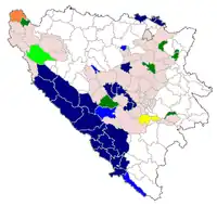 It is unclear what territory Croat federal unit would encompass. It is generally assumed it would comprise Croat-majority municipalities in the country, but the criteria haven't been clearly defined (whether two-thirds majority, absolute majority, or plurality would be required).[33] In some municipalities, especially in Central Bosnia, Croats have a small majority (Vitez, 55%) or just plurality (Mostar 48.4%, Busovača 49.5%). CRP's 2014 proposal assumed that in Central Bosnia, Vitez, Jajce, Busovača, Dobretići, Kiseljak, Kreševo and Novi Travnik together with the eastern, Croat-majority part of Fojnica municipality would become part of the Croat canton, while Gornji Vakuf-Uskoplje, Travnik, and Mostar would be districts in Bosniak-Croat condominia.[34] However, this proposal came before the 2013 census results had been published. Contrary to the previously held assumptions, these showed that Jajce and Novi Travnik did not have Croat majority.