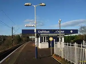 Croftfoot railway station is a railway station in South Lanarkshire that lies close to the Glasgow City council area / South Lanarkshire boundary serving the Croftfoot area of the City of Glasgow and the Spittal and Bankhead areas of the town of Rutherglen, Scotland. The station is managed by ScotRail and is on the Newton branch of the Cathcart Circle Line.