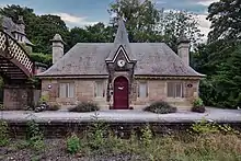 Originally known as Cromford Bridge, it was opened by the Manchester, Buxton, Matlock and Midland Junction Railway in 1849.[3] This is one of the few stations on the line that has been preserved and is a Grade 2 listed building. It is said to have been designed by G. H. Stokes, son-in-law of Joseph Paxton. It is believed that Stokes designed Station House (built in 1855), the extremely ornate former station master's residence opposite the station on the side of the hill as well as the ornate villa style waiting room, on what was the 'up' platform. According to English Heritage,[4] this is the original station building. The present station building on the opposite (down) platform was added by the Midland Railway at a later date