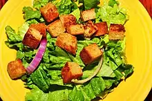 A crouton /ˈkruːtɒn/ is a piece of toasted or fried bread, normally cubed and seasoned. Croutons are used to add texture and flavor to salads[1]—notably the Caesar salad[2]— as an accompaniment to soups and stews,[1] or eaten as a snack food.