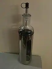 A cruet (/ˈkruːɪt/), also called a caster,[1] is a small flat-bottomed vessel with a narrow neck. Cruets often have a lip or spout and may also have a handle. Unlike a small carafe, a cruet has a stopper or lid. Cruets are normally made of glass, ceramic or stainless steel.