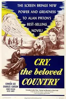 Cry, the Beloved Country is a 1951 British drama film directed by Zoltán Korda and starring Sidney Poitier, Charles Carson and Canada Lee, in his last film role. The film is based on the novel of the same name written by Alan Paton.