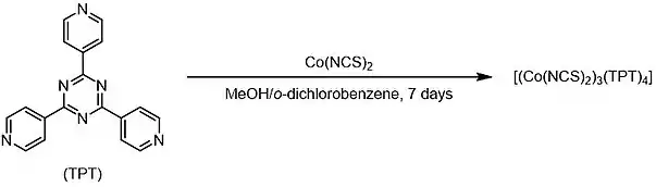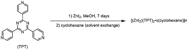 For preparation of [(ZnI2)3(TPT)2] crystalline sponges, the methanol solution of ZnI2 was added onto the top of TPT in nitrobenzene solution. After 7 days, the [(ZnI2)3(TPT)2] would form and can be isolated by filtration.[5][6]
