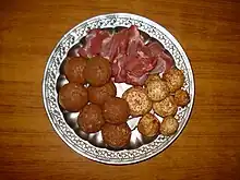 Kashmiris consume meat voraciously.[11][12] They share a love for lamb; the love a Kashmiri has for meat is unparalleled.[13][12] A good Kashmiri would not touch frozen meat, they feel it is not suited for the local cuisine.[14] They are, per capita, the highest mutton consumers in the subcontinent.[13] According to official data, around 2.2 million sheep are slaughtered in Kashmir every year on an average adding up to 21,000 tonnes annual meat consumption in the region.[15] Kashmiri Pandits are all Saraswat Brahmins, and hence avid meat-eaters.[16] The amount of mutton that is generally required to be bought for a Kashmiri Pandit wedding feast is 650 gm per head (not considering chicken).[17] Kashmiri Muslims prefer goat, especially young, while Kashmiri Pandits choose lamb.[18] Meat is called Neni by Pandits and Maaz by Muslims in Kashmir.[19] Asafoetida is mixed with yoghurt by Pandits and shallot mixed with garlic by Muslims.[5] In a majority of Kashmiri Pandit and Muslim cooking, bread is not part of the meal; it's always rice at lunch or dinner.[20] Bread is only eaten with tea in the morning or evening.[20] They may be bought from neighbourhood bakeries (qandurwan).[10]