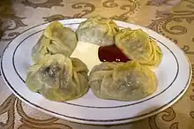 The introduction of flour to Kazakh cuisine brought about dishes such as bawyrsaq (бауырсақ), shelpek (шелпек), mänti (мәнті), and nan (нан). Bawyrsaq is made by frying dough balls, and shelpek is a flat cake made in a similar fashion.[7] Mänti, a very popular Kazakh dish, is a spiced mixture of ground lamb (or beef) spiced with black pepper, enclosed in a dough wrapper. Mänti are cooked in a multi-level steamer and served topped with butter, sour cream, or onion sauce. Nan is a type of traditional bread made in the tandyr oven, popular in cities along the Silk Way. Quymaq (құймақ), qattama (қаттама), and oyma (ойма) are flat puff cakes fried in oil then covered in cream. Another sweet is shek-shek (шек-шек).