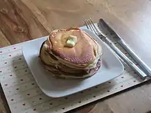 The Welsh have their own versions of pancakes: crempogau (sing. crempog) (sometimes called ffroes, sing. ffroesen) are traditionally layered on top of each other to form a large cake. Some are very much like American pancakes; others may be made with yeast (called crempogau burum, sing. crempog furum) or oatmeal (although this is also true of American pancakes) and some are like Scotch pancakes.[170][171]