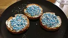 A widespread tradition is that of serving beschuit met muisjes when people come to visit a new-born baby and its mother. Beschuit is a typical Dutch type of biscuit, muisjes are sugared anise seeds. Blue muisjes are used for a baby boy, and pink muisjes are used for a baby girl.