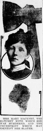 On October 26, 1910, the body of the 26-year-old Hackney, who had moved to the city with her husband Harley in 1906 from Louisville, Kentucky,[15] was found in her Canal Ridge boarding house home by her spouse and one of the boarders, Charles Eckert.[16] Her throat had been cut from ear to ear, her skull crushed, with her body and face slashed in several places,[16] apparently with an axe.[17] A search of the home revealed no other crime had been committed.[17][18]