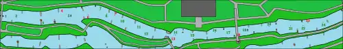 The centre has two parallel whitewater channels; the drop is the same for both channels, 6.6 meters (22 feet). The left channel is 356 meters long, with a 1.9% slope of 19 m/km (98 ft/mile) and a streamflow of 7 to 22 m3/s (247 to 777 ft3/s). The right channel is 460 meters long, with a 1.4% slope of 14 m/km (76 ft/mile) and a streamflow of 7 to 12 m3/s (247 to 424 ft3/s). When both channels are watered, the left channel streamflow is 15 m3/s (530 ft3/s) and the right is 7 m3/s (247 ft3/s).[1]