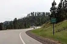 Custer County lies on the west line of South Dakota. Its west boundary line abuts the east boundary line of the state of Wyoming. The Cheyenne River flows northeastward along the upper portion of the county's east boundary. Battle Creek flows southeastward in the upper eastern part of the county, discharging into Cheyenne River along the county's northeastern boundary line. Spring Creek flows northeastward through the upper eastern part of the county, discharging into the river just north of the county border. The county terrain is mountainous, especially its western portion.[4] The terrain slopes to the east; its lowest point is its NE corner at 2,461 ft (750 m) above sea level (ASL). Its highest point is a mountain crest along the north boundary line, at 6,657 ft (2,029 m) ASL.[5]