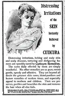 In 1908, the British Medical Journal investigated the advertising of nostrums for the treatment of skin diseases. As reported by the American Medical Association[3] it was implied that Cuticura soap could be effective in the treatment of syphilis when prepared as an internal remedy known as Cuticura Resolvent. The medical community considered the proposed remedy to contain insufficient potassium iodide to be effective in the treatment of the disease.[4]