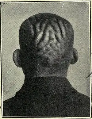 Cutis verticis gyrata is a medical condition usually associated with thickening of the scalp.[1] The condition is identified by excessive thickening of the soft tissues of the scalp and characterized by ridges and furrows, which give the scalp a cerebriform appearance. Clinically, the ridges are hard and cannot be flattened on applying pressure. Patients show visible folds, ridges or creases on the surface of the top of the scalp.[2] The number of folds can vary from two to roughly ten and they are typically soft and spongy. The condition typically affects the central and rear regions of the scalp, but sometimes can involve the entire scalp.