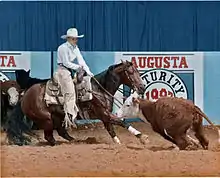 A cutting horse is said to possess an innate ability to anticipate or read a cow's intended moves; an ability commonly referred to as having cow sense or cow smarts.[2] Competitive cutting horses are well-trained and conditioned athletes with skills honed to constrain the movement of a cow and prevent it from returning to the herd. Such horses are able to stop and turn instantaneously, in sync with a cow's every move. The harder a cow tries to get back the herd, the more instinct, skill and athleticism are required of the horse to stay head to head with the cow, and the higher the competition score. A common analogy is a basketball point guard holding off a defender.[3] American Quarter Horses and other horse breeds with Quarter Horse ancestry, such as American Paint Horses are the most popular choices for the sport, although other breeds with stock horse type are also used, particularly in breed-specific competition.