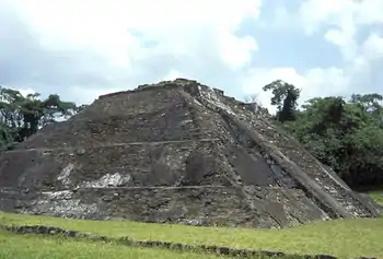 This is a four bodied pyramid and a small vertical wall; remains of blue and red paintings were found on it. Objects found on this building are: a knife, fine ceramics and tablets with Quetzalcoatl engravings, indicate that the building was used for ritual functions.[1]