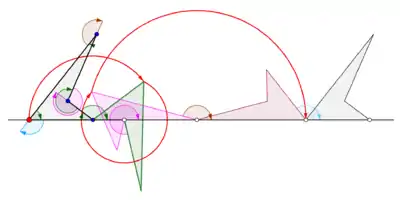 ![]() Animation showing the generation of one arch of a cyclogon by an equilateral triangle as the triangle rolls over a straight line without slipping. | ![]() Animation showing the generation of one arch of a cyclogon by a square as the square rolls over a straight line without slipping. |