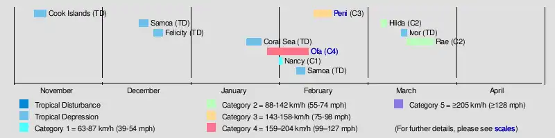 | Rae | March 16 – 25 | Category 2 tropical cyclone | 95 km/h (60 mph) | 985 hPa (29.10 inHg) | Tuvalu, Fiji, Tonga | 3 | [19] | |
