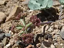 Cymopterus basalticus is a species of flowering plant in the carrot family known by the common name Intermountain wavewing. It is native only to parts of Utah and White Pine County, Nevada in the United States. It is a perennial herb, 5 cm (2.0 in) to 15 cm (5.9 in) tall, and produces purple or yellow flowers in spring. C. basalticus grows on bare basaltic and clay soils typically in pinyon-juniper woodland and sagebrush communities.[1][2]
