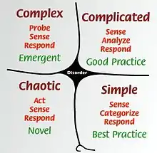 - Snowden and Boone (2007): "The framework sorts the issues facing leaders into five contexts defined by the nature of the relationship between cause and effect. Four of these—simple, complicated, complex, and chaotic—require leaders to diagnose situations and to act in contextually appropriate ways. The fifth—disorder—applies when it is unclear which of the other four contexts is predominant."[2]
