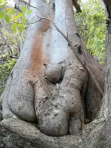 In exposed areas, it tends to be shorter and more robust - only a few meters tall. In more protected environments, it grows up to 10 meters in height. The wood is soft and fleshy, like that of a true baobab. It is therefore sometimes confused both with the Baobab (Adansonia digitata) or with the genera Calpidia or Pisonia which all have similar fleshy trunks.