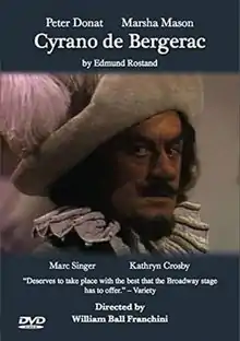 Cyrano de Bergerac is a 1974 videotaped television production of Edmond Rostand's famous 1897 play about the lovestruck swordsman with the long nose.[1] This production was originally staged by American Conservatory Theater and shown on PBS as part of the Theater in America series.[2][3] It uses Brian Hooker's 1923 translation of the play (with some uncredited revisions), and stars Peter Donat as Cyrano, Marsha Mason as Roxane, Marc Singer as Christian de Neuvillette, and Paul Shenar as the Comte de Guise.[4] Kathryn Grant (wife of Bing Crosby) has a brief role as Lise, the unfaithful wife of pastry cook Ragueneau – a role cut in some productions of the play because of its brevity.
