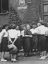 The school soon returned to pre-war scale; in 1946 there were 730 girls enrolled.[50] Initially education adhered to different formulas, resulting in age of students ranging from 11 to 28.[51] The curriculum was unified in 1948, when the establishment was formally turned from Państwowe Gimnazjum i Liceum Żeńskie into Szkoła Ogólnokształcąca Stopnia Licealnego. In line with the nationwide framework of an 11-year general education scheme, the establishment offered schooling in 4 highest grades.[52] Mounting political pressure introduced new rituals,[53] modifications of curriculum,[54] left-wing youth organizations[55] and staff changes,[56] which in the late 1940s resulted in totally new profile of the institution. It is not clear whether the school met expectations of the schooling board; on the one hand, control results were far from satisfactory[57] and there are news of some conspiracy groupings among the girls,[58] on the other, the school got Ministry of Education awards.[59] The new policy climaxed after 1954, when Dąbrówka was renamed to VII Liceum Towarzystwa Przyjaciół Dzieci.[60] In wake of the 1956 political thaw both scouting[61] and religious instruction[62] re-appeared in school; in 1957 Dąbrówka returned to its traditional name.[63]
