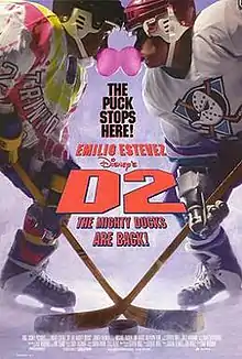 D2: The Mighty Ducks (also known as The Mighty Ducks 2) is a 1994 American family sports comedy-drama film directed by Sam Weisman. It is the second installment in The Mighty Ducks trilogy, and a sequel to the 1992 film The Mighty Ducks produced by Walt Disney Pictures, The Kerner Entertainment Company and Avnet–Kerner Productions. Emilio Estevez, Joshua Jackson, Elden Henson, Shaun Weiss, Brandon Adams, Matt Doherty, Garette Ratliff Henson, Marguerite Moreau, Vincent Larusso, Brock Pierce, Robert Hall, and Bob Miller reprise their roles in the film with Michael Tucker, Jan Rubeš, and Kathryn Erbe joining the cast. It was followed by the final film of the series, D3: The Mighty Ducks, in 1996.